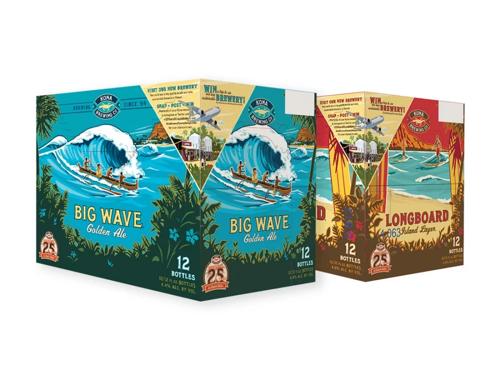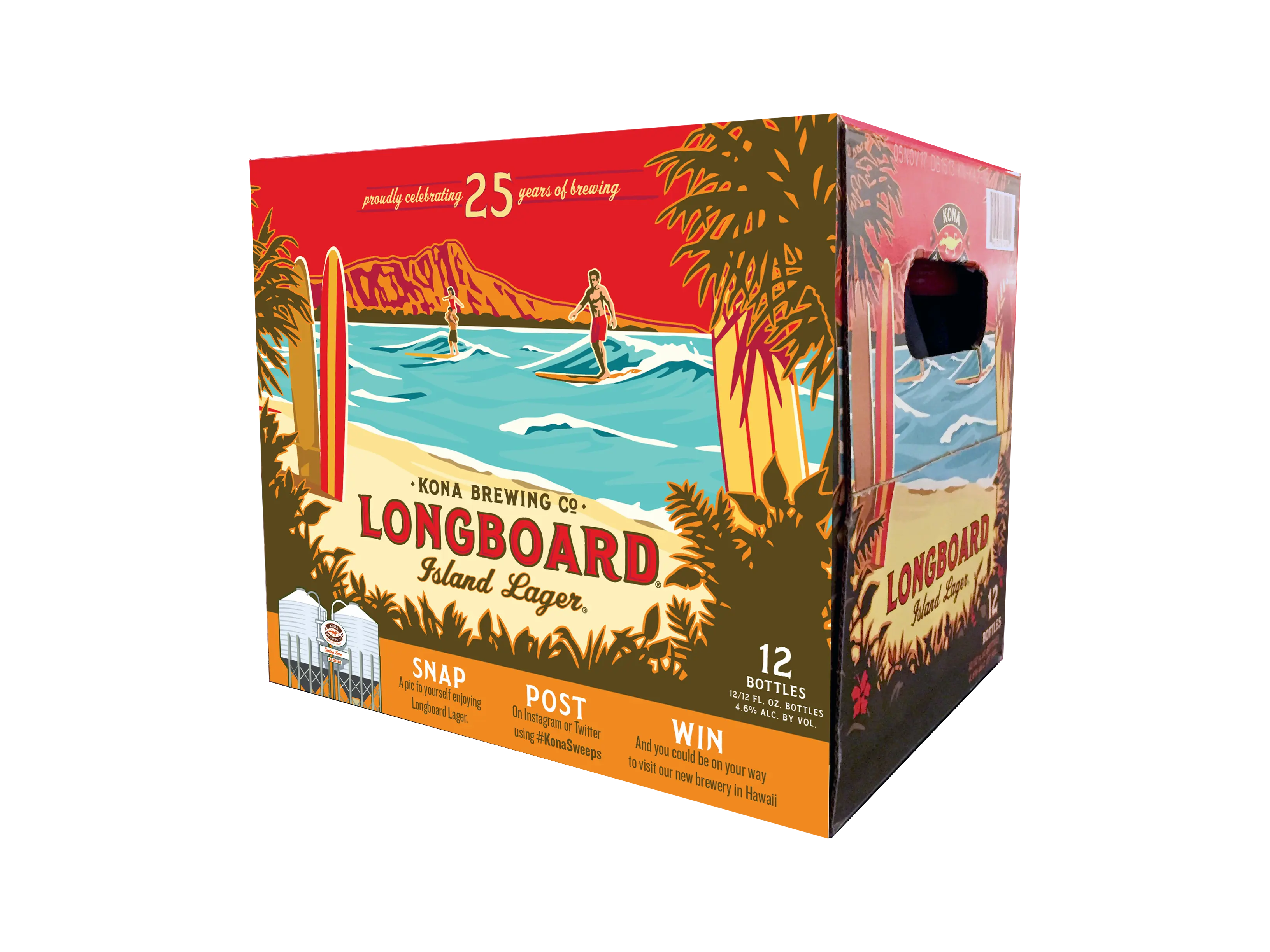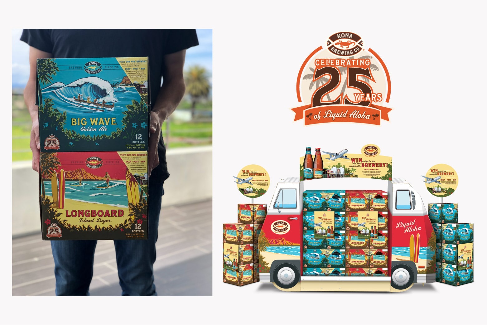 In celebration of Kona Brewing Co.’s 25th anniversary and the grand opening of their new brewery in Hawaii, I was tasked with the exciting challenge of leading the design for a special on-package sweepstakes. This project involved a creative takeover of Kona Brewing Co.’s classic beer packaging, integrating a commemorative 25th anniversary seal and sweepstakes details into the design.